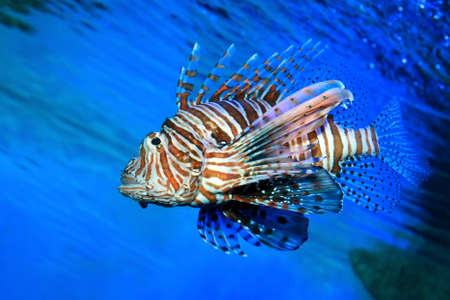 Beautiful lionfish swims in blue water, fish