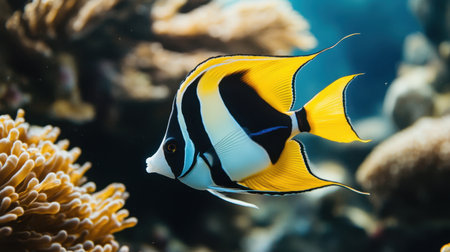 A striking Moorish idol fish gliding gracefully through the tropical waters near a reef.
