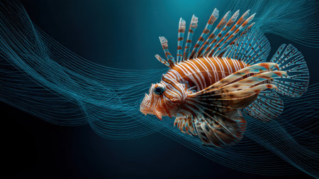 A stunning depiction of a lionfish gracefully swimming against a rich blue backdrop, showcasing its vibrant colors and elegant fins, perfect for marine-themed projects.