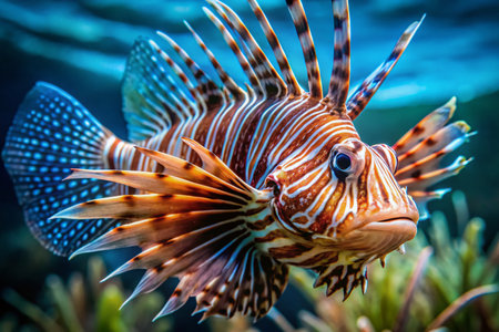 A close-up of a lionfish displaying its striking striped pattern and venomous spines, exuding both beauty and danger.