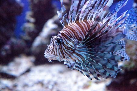 Zebra lionfish or zebra fish or striped lionfish lat. Pterois volitans is a species of ray-finned fish of the scorpion family in an aquarium on a blue background