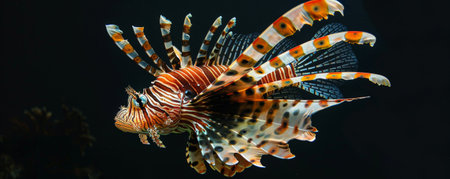 A majestic lionfish gliding gracefully through the water, its long, spiny fins fanned out beautifully against a black background. The intricate patterns and vibrant colors of the lionfish are highlighted in this stunning underwater scene.