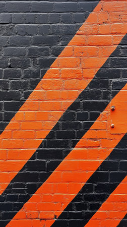 A vibrant brick wall is decorated with alternating stripes of black and bright orange, creating a striking visual impact that enhances the surrounding urban environment.