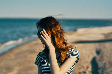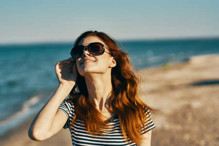 portrait of happy red-haired woman in nature on the beach near the sea and glasses on her face