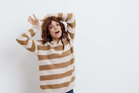 crazy woman hand in hair on gray wall background