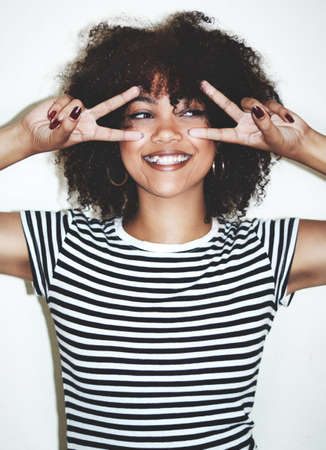 Fun on fleek. Studio shot of a playful young woman showing the peace sign against a gray background.