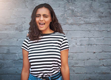 Portrait of a young woman winking against a grey wall.