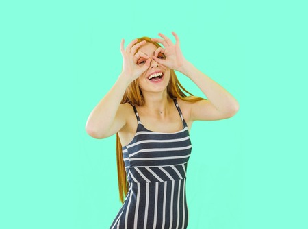 Closeup portrait of beautiful joyful girl looking at the camera through her fingers as an eyeglass on an isolated background
