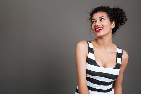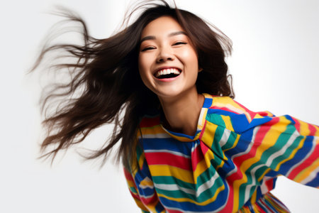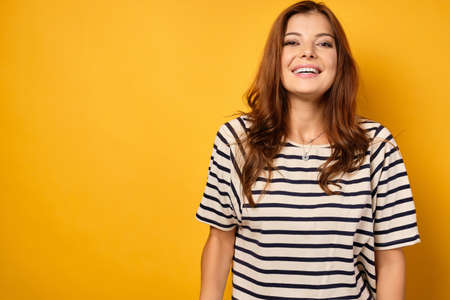 Beautiful brunette with her hair standing on a yellow background and laughing.