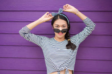 young fashionable woman wearing sunglasses ah-ah casual clothes posing pink background