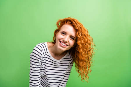 Photo of shiny adorable young woman wear striped shirt smiling isolated green color background