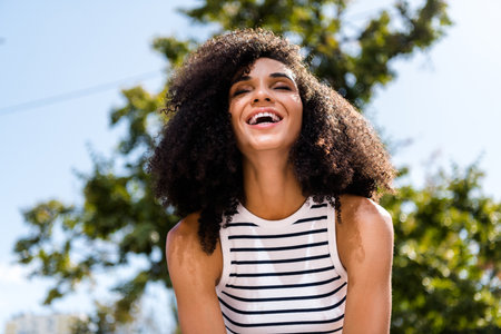 Photo of positive cheerful funny cute girl having fun enjoying summer vacation free time walk in green park outside