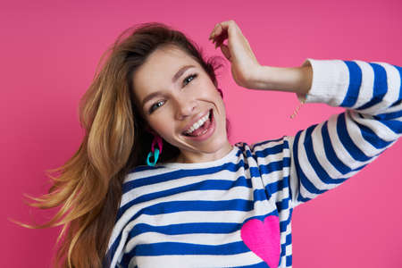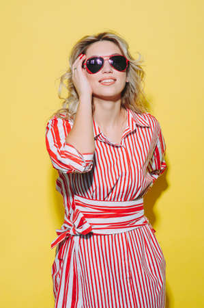 Portrait of beautiful caucasian friendly positive funny woman standing in studio looking in camera with red lips in bright clothes