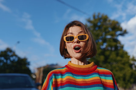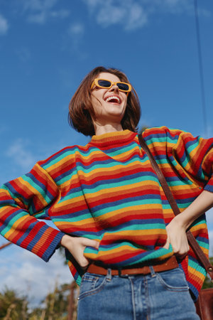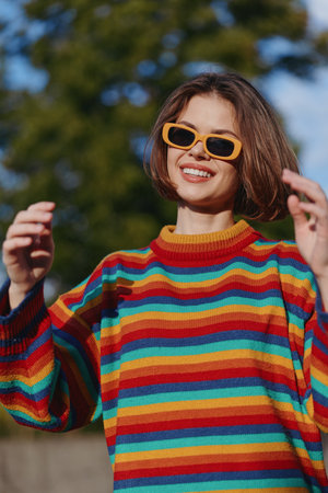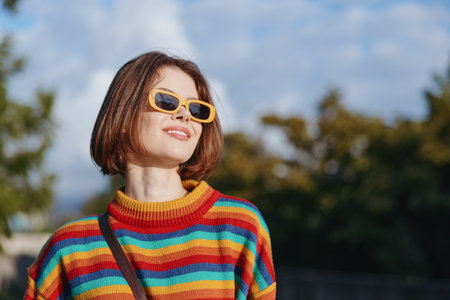 Young woman in a rainbow sweater and orange sunglasses smiling outdoors on a sunny day. Casual outfit, short hair, lifestyle portrait of joyful urban leisure and walking.