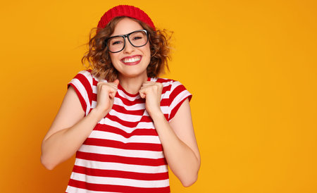 Delighted young woman in trendy outfit smiles, clenching fist and rejoices and looking at camera against yellow background
