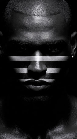 This striking portrait features a man with serious expression, highlighted by bold horizontal stripes across his face. The black background enhances his intense gaze and strong features.