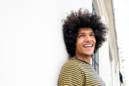 Side portrait of happy handsome young man leaning against white wall and laughing