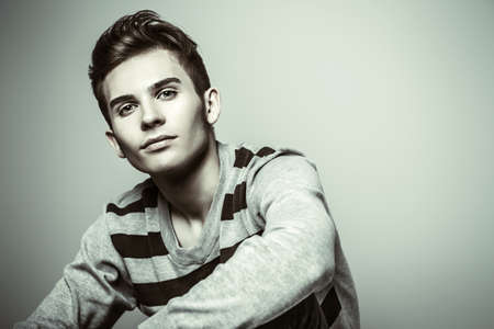 Portrait of a handsome teenage boy over gray background. Studio shot. Teen fashion.