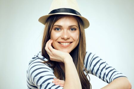 Portrait of beautiful young woman wearing white striped shirt, black round hat on dark blue background