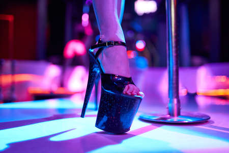 Young sexy woman pole dancing striptease with pylon in night club. Beautiful naked stripper girl on stage. Beautiful female legs in high-heeled shoes strips