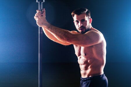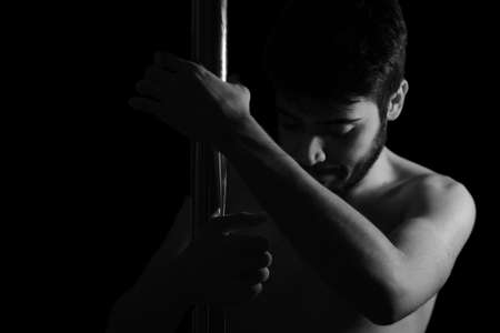 Dramatic dark portrait of a young man with a pole dance bar. Dark background studio shot. Black and white image.