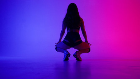 In a shot on a multi colored, dark background, gradient squatting woman. Demonstrates a dance move in twerk style, in open clothes. She stands with her back to the camera, sexy, rhythmic