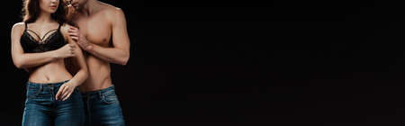 Horizontal crop of muscular man touching sexy woman in bra and jeans isolated on black