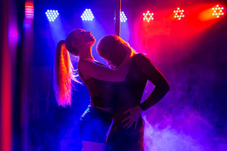 Two young sexy women dance a striptease near the pylon and kiss