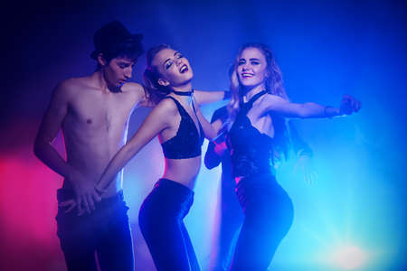 Disco, night party concept. Group of cheerful young people dancing at a night party. Beauty, fashion. Entertainment.