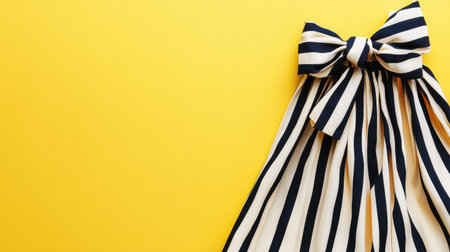 This image showcases an elegant navy and cream striped ribbon bow on a bright yellow background, perfect for decoration, craft projects, or fashion accessories.
