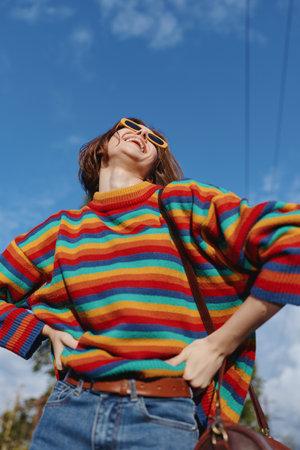 Woman in a colorful striped sweater smiling with yellow sunglasses under a bright blue sky, hands on hips, casual outfit and joyful urban lifestyle portrait full of confidence.