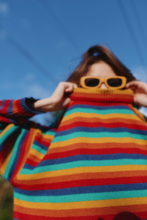 Striped sweater young woman sunglasses outdoor colorful covering face casual outfit blue sky, mid twenties model pulling turtleneck up, playful mood, cozy knitwear portrait for lifestyle and fashion.