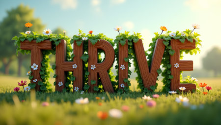 Wooden THRIVE letters surrounded by digital vines and flowers in a vibrant farm setting