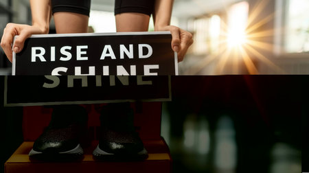 Woman holding rise and shine sign, success and motivation concept on abstract blurred background.