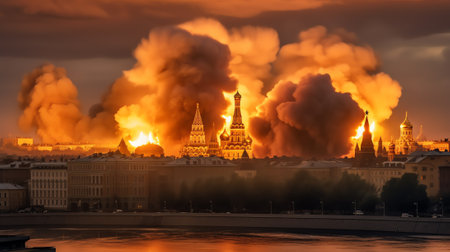 aerial view. Ruined metropolis, City in fire and smoke. Generative AI