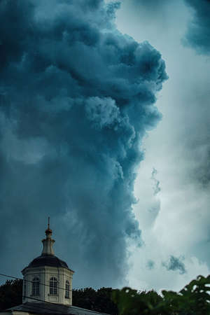 Thick smoke bills into the sky as buildings stand in the foreground, indicating an emergency or disaster in an urban setting during twilight hours.