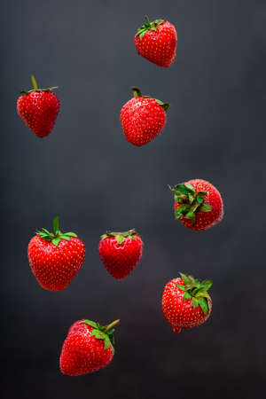 Falling strawberry isolated on Black background, selective focus