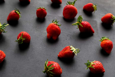 Strawberries spread out on a black background.