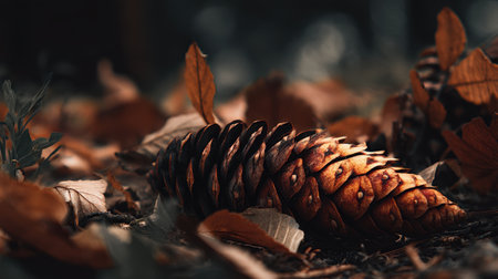 A beautifully detailed close-up of a pine cone on the forest floor, surrounded by fallen leaves. Soft natural lighting enhances the serene autumn ambiance in this tranquil setting.