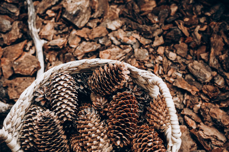 Fir tree cones in old wicker basket in summer park on green grass background.