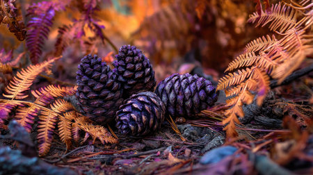 A captivating close-up of vibrant pine cones nestled among colorful autumn ferns. This image captures the beauty of nature's seasonal changes and intricate details.