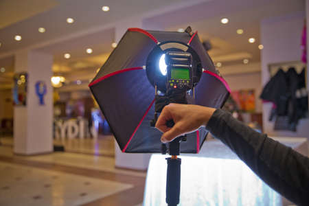 close up to Studio LED sportlight on tripod and standy in the event room.