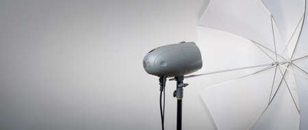 Photography set up. Professional photography studio flash light with reflective umbrella.