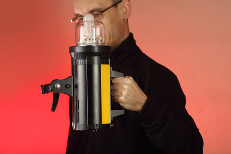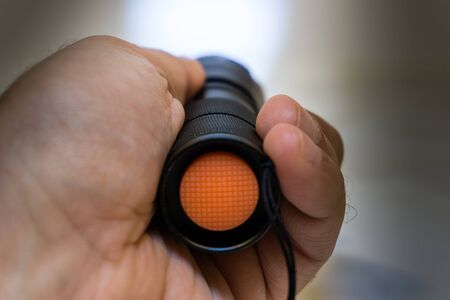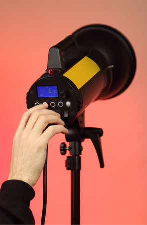 man fixing the lighting equipment, close up cropped photo. guy testing a new tool, man controlling the work of lamp