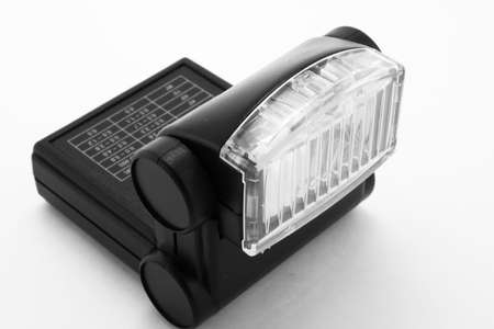Head of a camera flash, over a white background with the orange gels for a color temperature orange (CTO).
