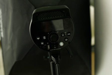 Kiev, Ukraine - January 29, 2022: On-camera flash of the Godox brand on a dark background.
