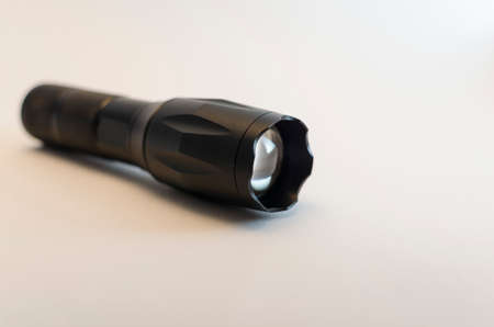 Flashlight and a beam of light in darkness. A modern led lamp with bright projection on dark table. Surface with copy space.