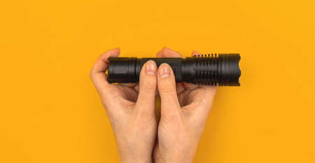 Banner hand hold flashlight on office desk yellow orange background, top view, workspace concept with copy space