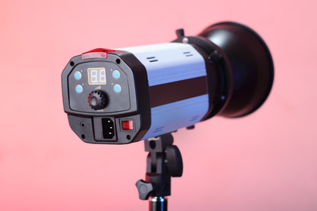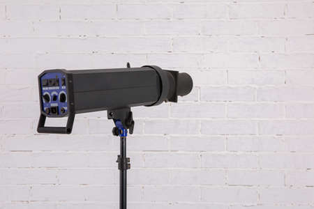 Photography studio flash on a lighting stand isolated on black background with copy space. Proffetional equipment like monobloc or monolight