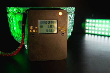 Homemade household dosimeter of radiation ionizing radiation. Overdose in the old Soviet crystal, vase, salad bowl, sugar bowl. Concept of dangerous objects at home. green light.